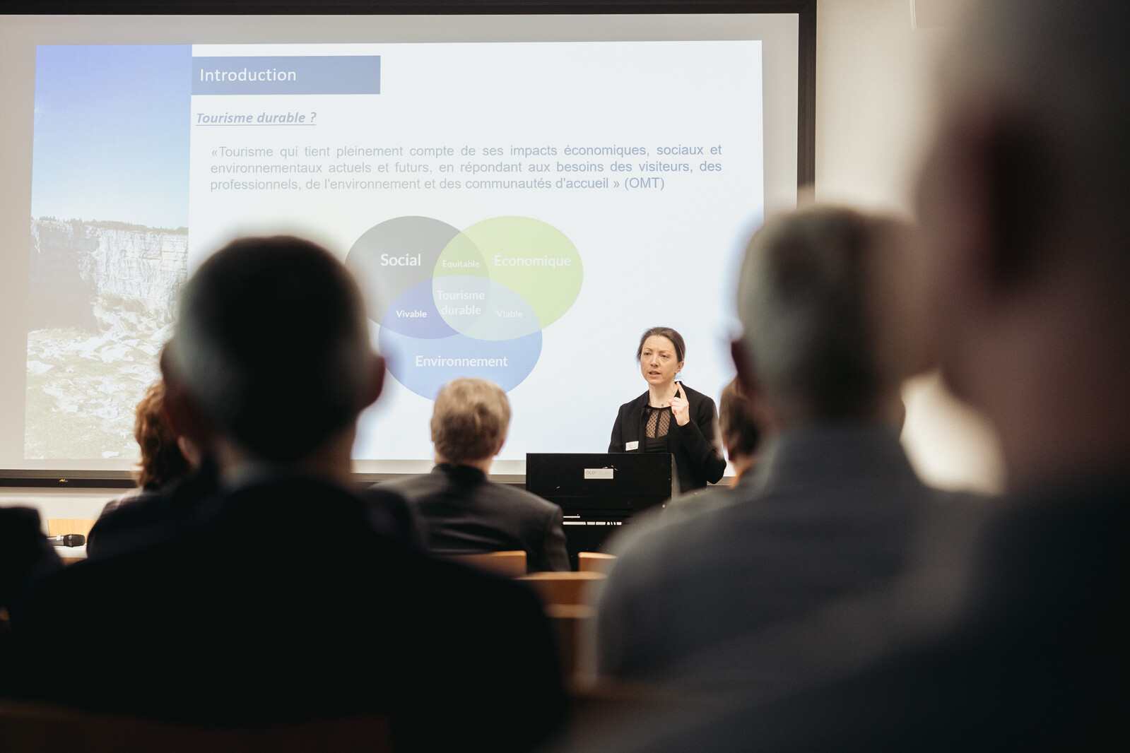 Der Abend setzte sich mit einem Vortrag von Emilie Jaccard zum Thema «Auf dem Weg zu einem nachhaltigen Vier-Jahreszeiten-Tourismus in der Region Jura & Drei-Seen-Land» fort. Ihre Dissertation zu diesem Thema hatte sie im Jahr 2023 an der Universität Lausanne verteidigt. Der Vortrag eröffnete eine Diskussion über die Herausforderungen des nachhaltigen Tourismus und die Entwicklungsperspektiven der Region. Im Anschluss fand bei einem Apero ein geselliger Austausch statt.